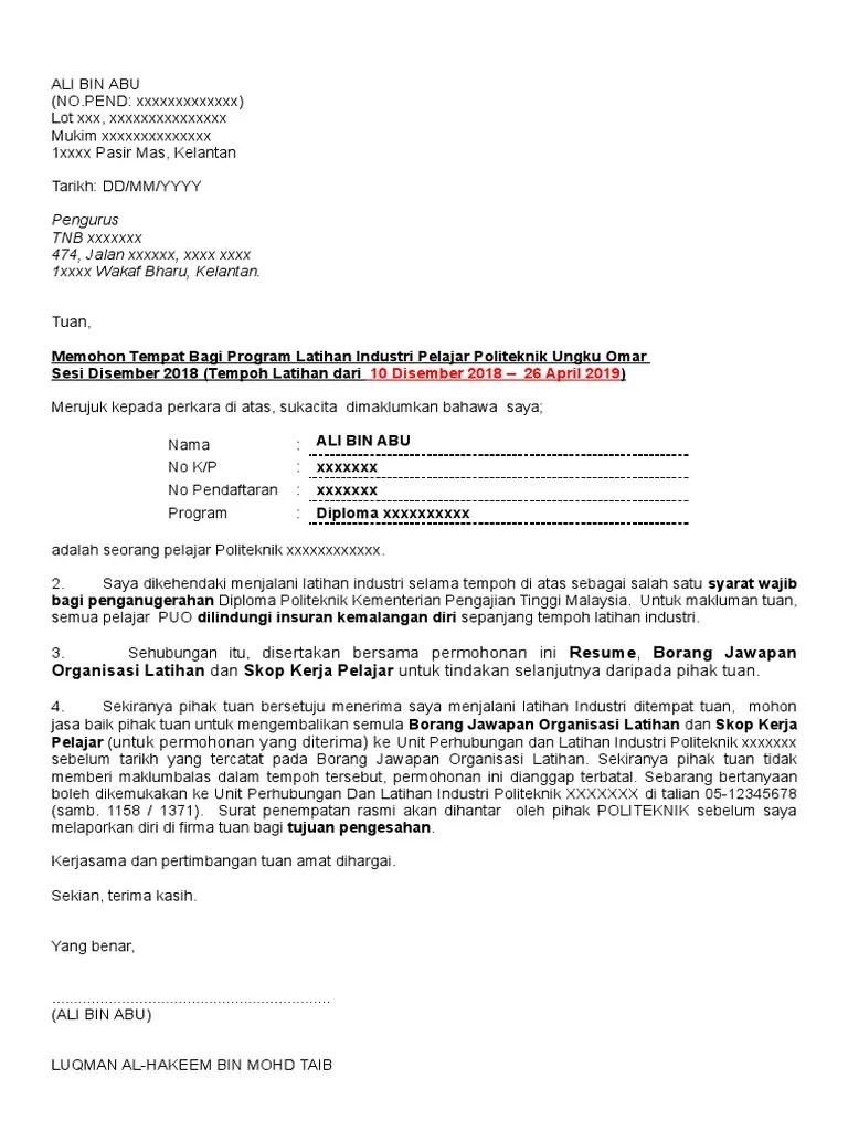 No.1818, jalan sungai rambai, bukit mertajam, pulau pinang tel: Saya yang bernama seperti di atas ingin memohon jasa baik pihak tuan/puan agar memberi peluang kepada . Contoh surat permohonan latihan industri praktikal, surat rasmi permohonan latihan praktikal, surat rasmi latihan industri, cara mohon latihan industri,